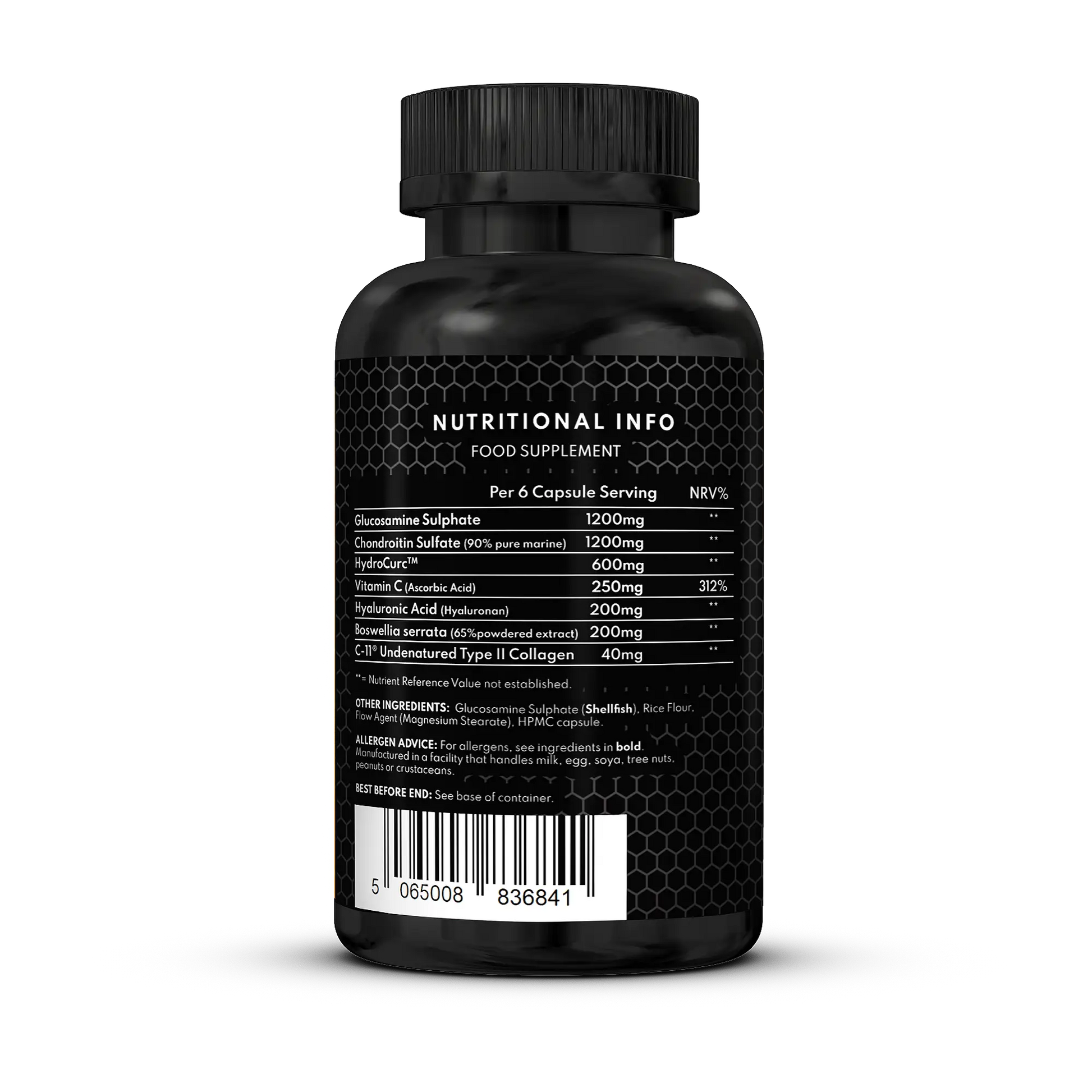 A carefully formulated joint support supplement combining a blend of well-known ingredients including Glucosamine Sulphate, Chondroitin Sulfate (90% Pure Marine), HydroCurc™, Vitamin C, Hyaluronic Acid, Boswellia Serrata, and C-II® Undenatured Type II Collagen.